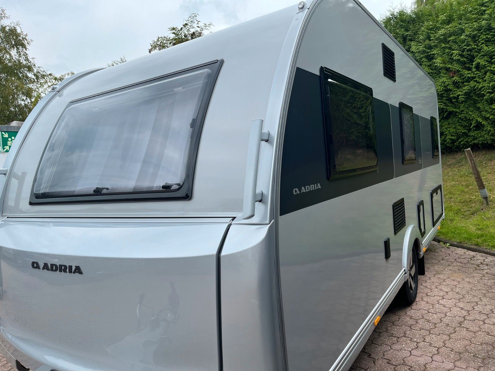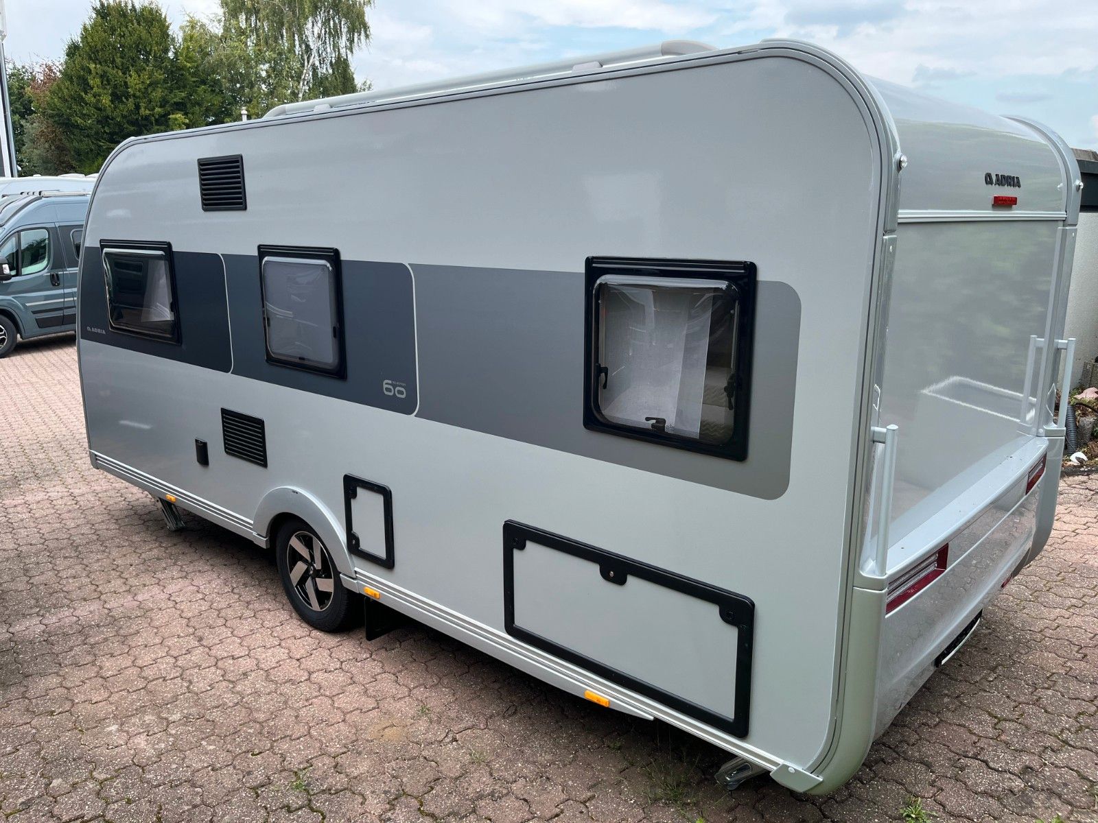 GfK-Außenhaut in silbergrau mit 60Y Grafikdesign, Schwerlastkurbelstützen, Antischlingerkupplung, Stoßdämpfer, 15“-Leichtmetallfelgen(ADRIA-Design), 15“-Ersatzrad, Spritzlappen, Radhausverkleidung Vorzeltseite, Fliegenschutz Eingangstür,Panorama-Dachhaube Heki II,Verdunkelungsrollos mit Fliegenschutz an allen Fenstern außer Bad,Verdunkelung Badezimmer, Evopore Schaumstoffmatratze, Batterieladegerät mit Batteriekasten (Autark-Vorbereitung), Absorber-Kühlschrank 140l (502 UL), Spülen-Abdeckbrett im