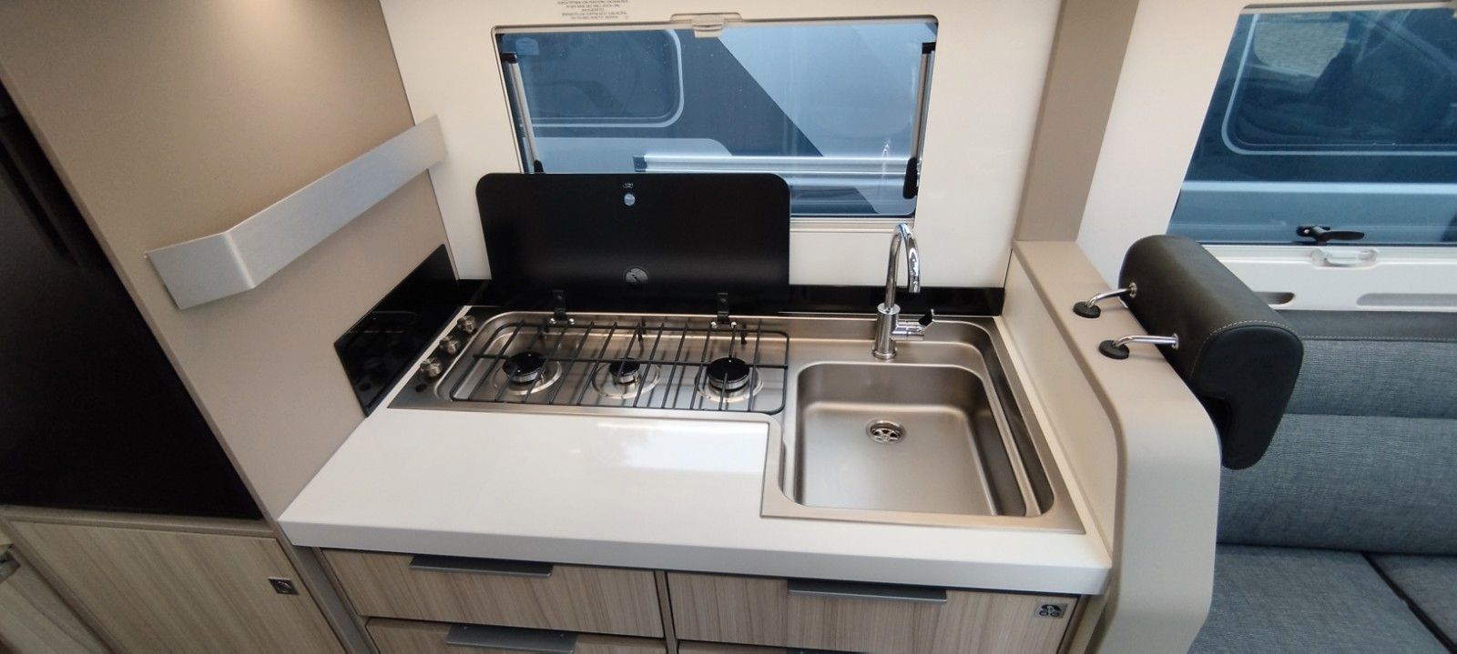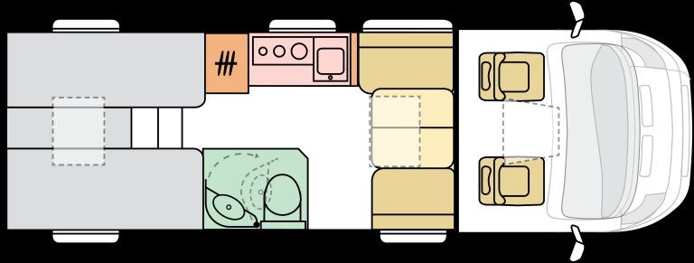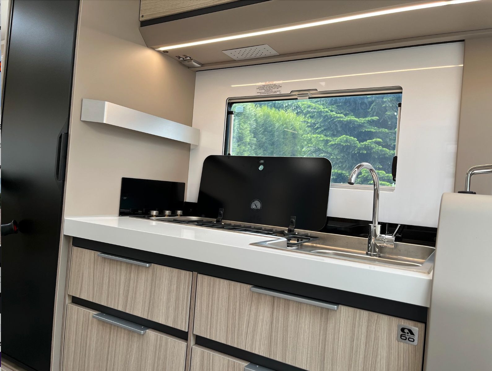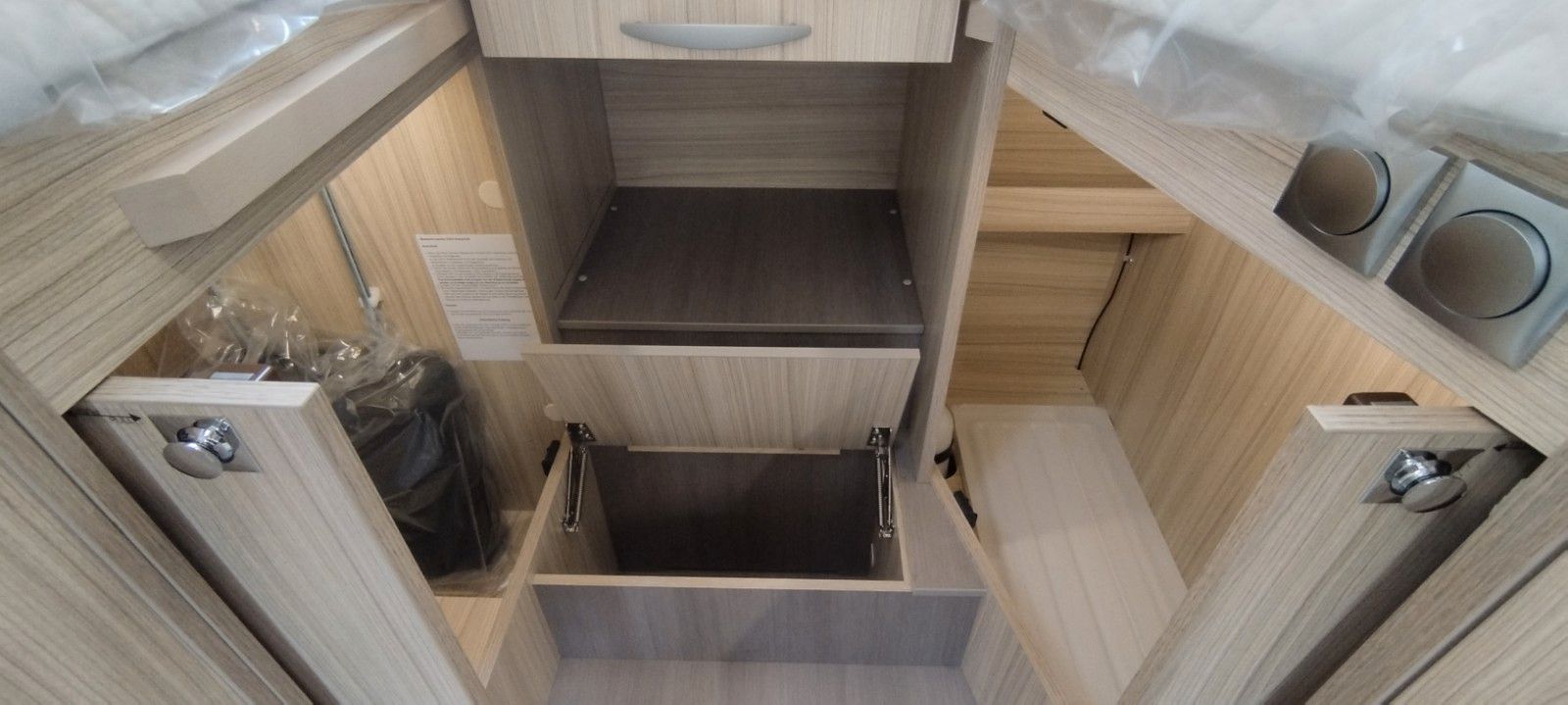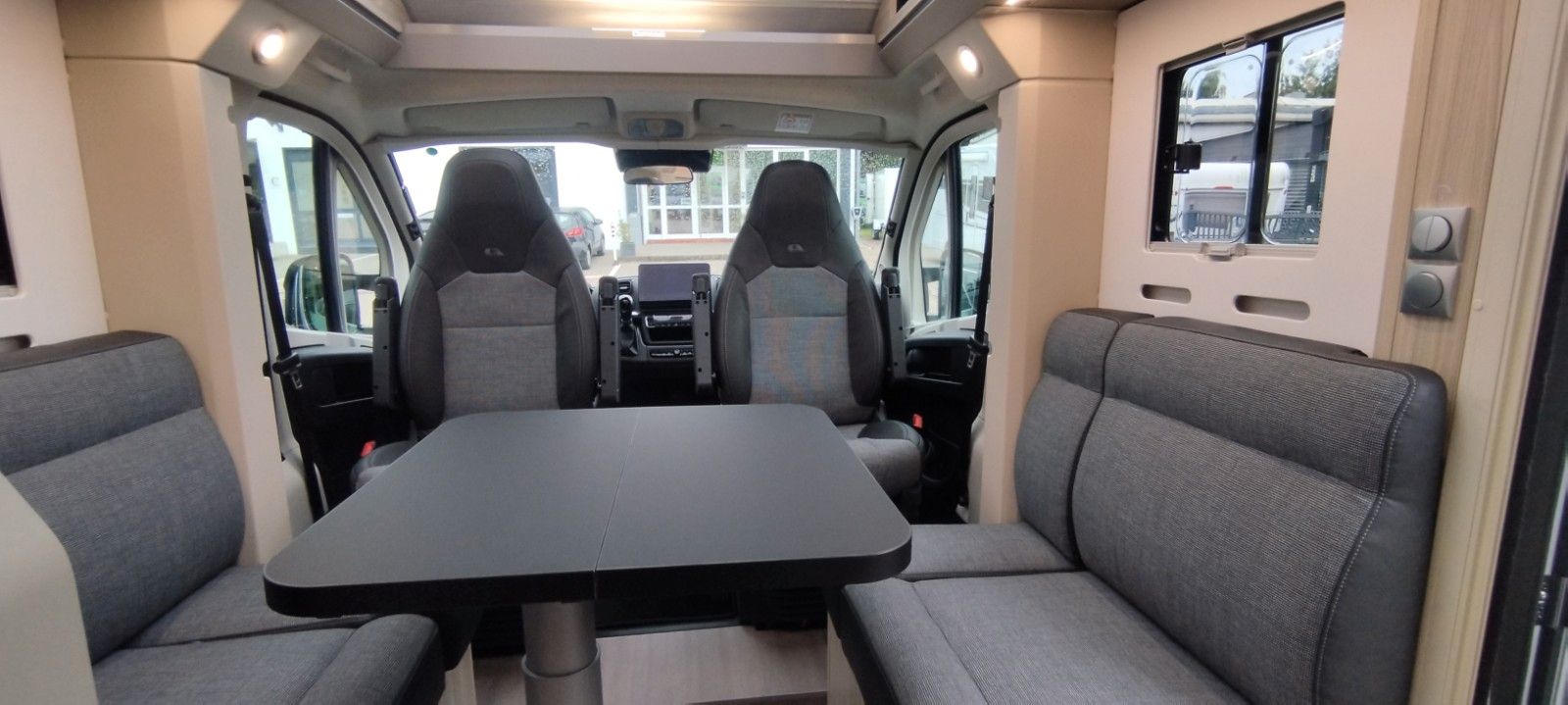 Achtung, die Bilder zeigen das Modell mit kleinem Kühlschrank ohne Markise und die Hängeschränke nicht in Unioptik, die Bilder werden zeitnah aktualisiert.