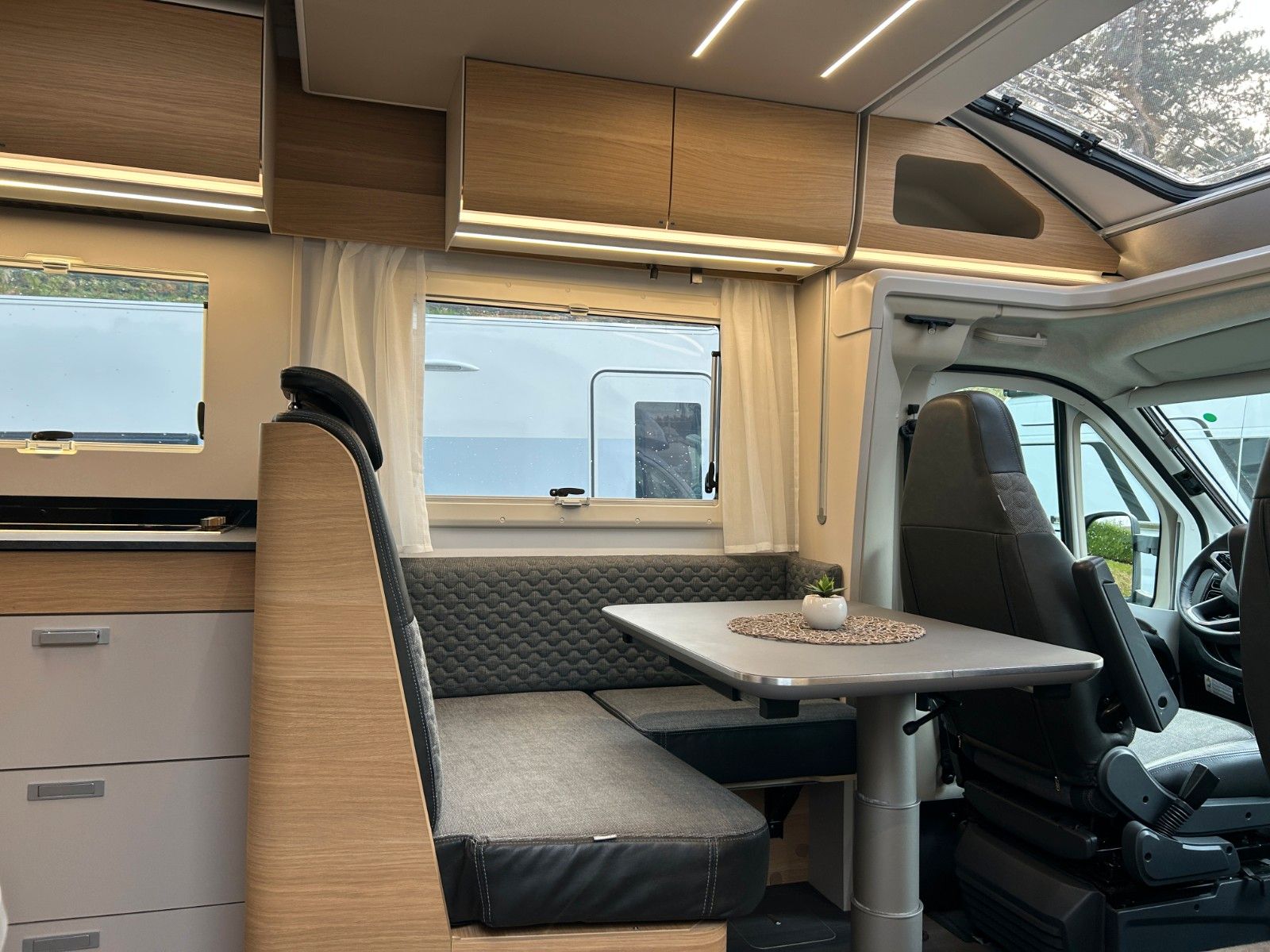 Polster "Arno", Chassis Fiat Ducato mit Tiefrahmen, Airbag Fahrer+Beifahrer, ABS, ASR, ESP, EBD, HBA, LAC, MSR, Hillholder, Traction+, Tagfahrlicht, LED-Rücklicht, Klimaanlage FH, Außenspiegel elek. verstell- und beheizbar, Fensterheber FH elek., Funk-Zentralverriegelung FH, Tempomat, dreh- und höhenverstellbare Komfort-FH-Sitze mit Armlehnen im Wohnraumdesign, Abgasnorm Euro 6e, ECO-PACK (Stopp-Start + Lichtmaschine intelhgent), Getriebe manuell (6+R), 16"-Räder (bei Automatik-Getriebe), Reifen-Reparatur-Set, Frontstoßfänger lackiert in FH-Farbe, Wohnraumfenster mit Rahmen, Funktions-Doppelboden, AGM-Wohnraumbatterie 100Ah, Ladestation 230V / 12V in Garage, Sicherheits-Gasregler MonoControl CS, Dunstabzug, Abdeckung Kocher + Spüle (außer Matrix Axess 600 SL), Abtropfschale, Cassetten-Toilette mit elektrischer Spülung, Hubbett über Dinette.