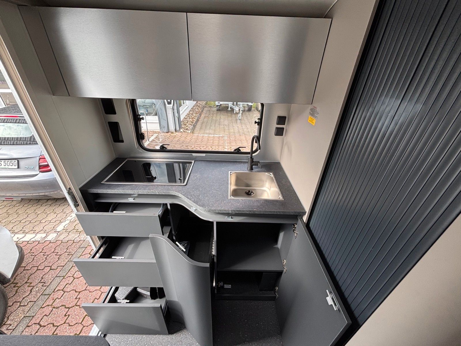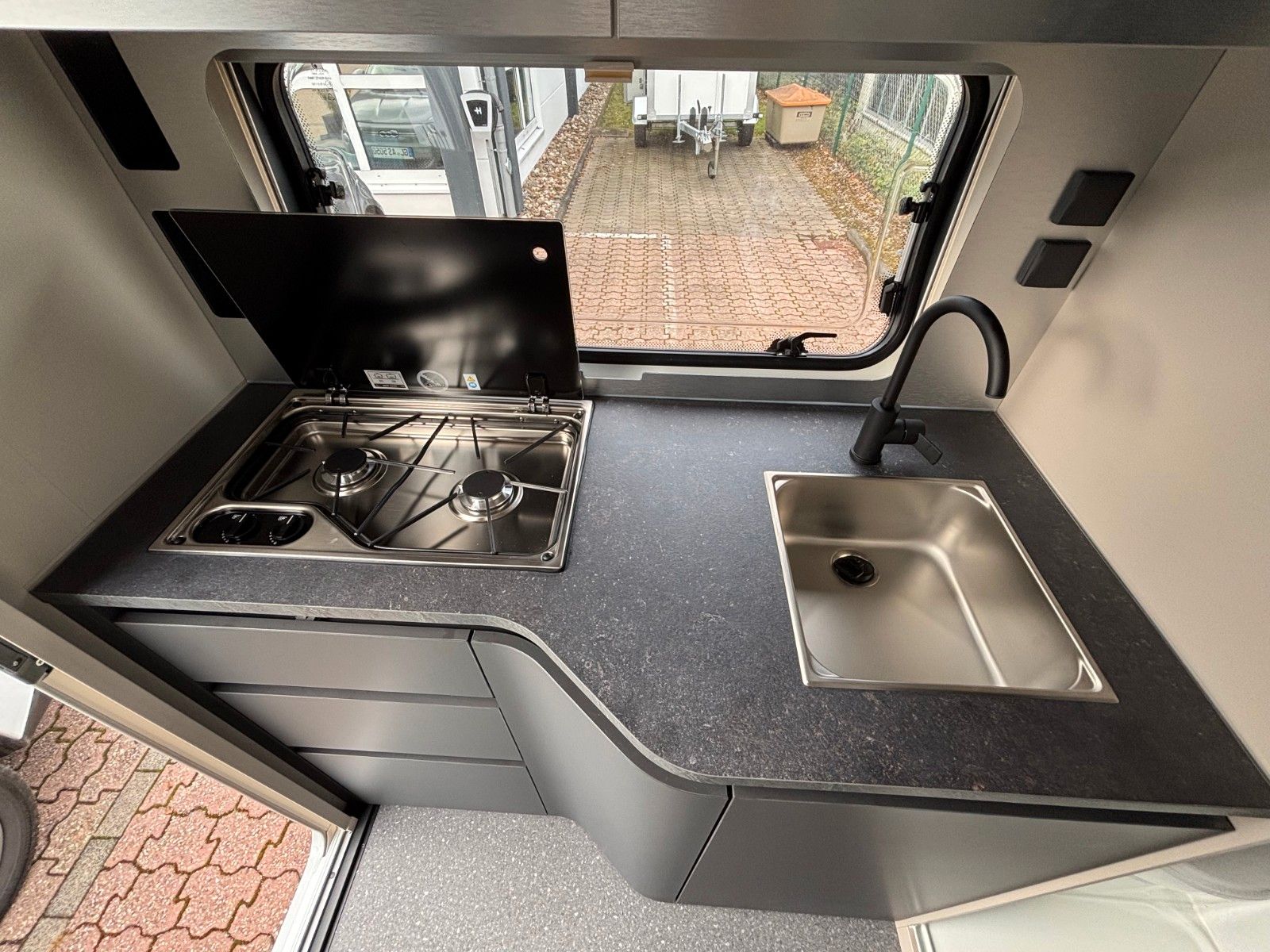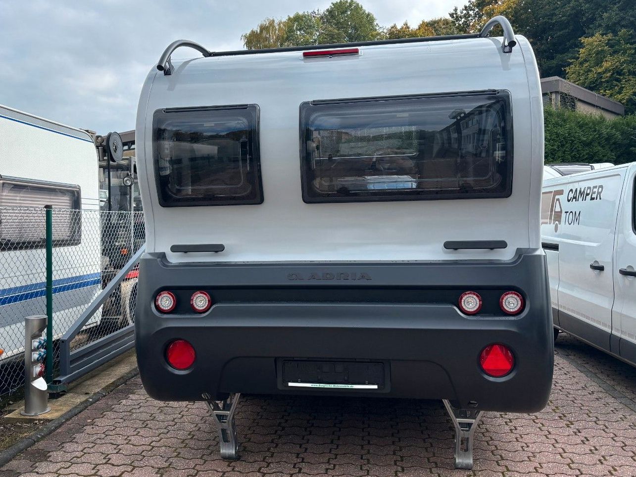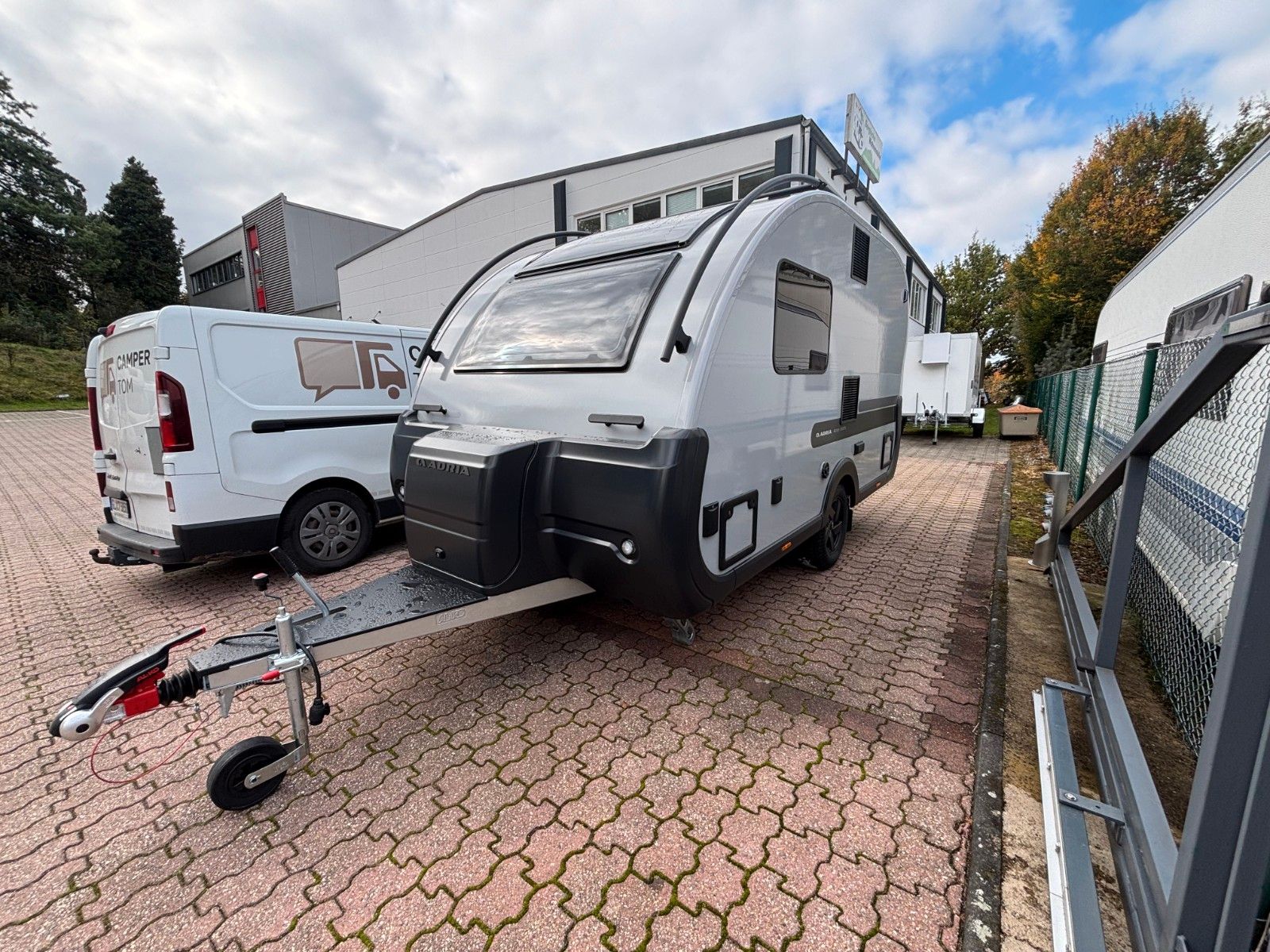 Der Wohnwagen steht vor Ort.