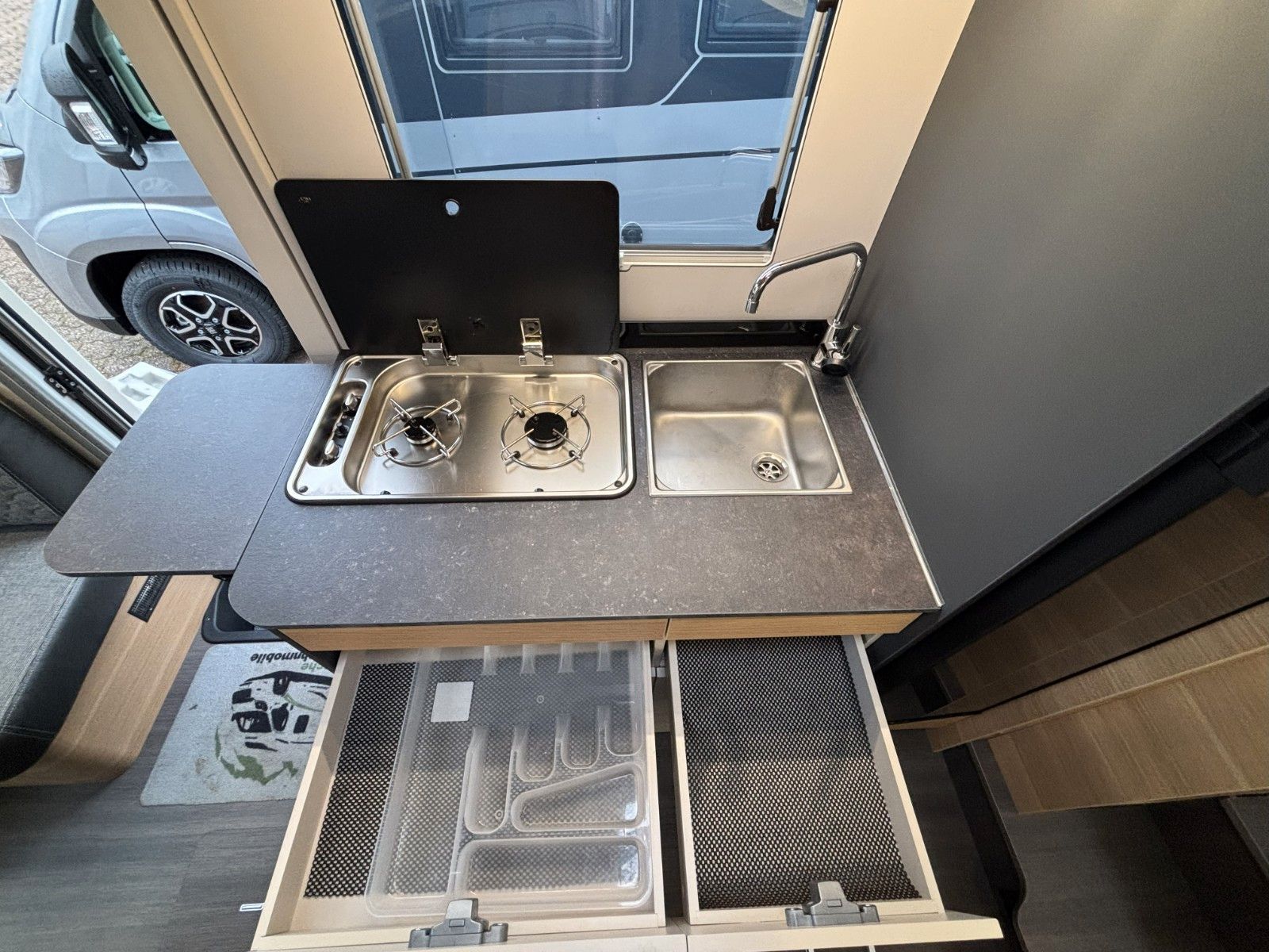 Polster "Arno", Chassis Fiat Ducato mit Tiefrahmen, Airbag Fahrer+Beifahrer, ABS, ASR, ESP, EBD, HBA, LAC, MSR, Hillholder, Traction+, Tagfahrlicht, LED-Rücklicht, Klimaanlage FH, Außenspiegel elek. verstell- und beheizbar, Fensterheber FH elek., Funk-Zentralverriegelung FH, Tempomat, höhenverstellbare Komfort-FH-Sitze mit Armlehnen im Wohnraumdesign, Abgasnorm Euro 6e, ECO-PACK (Stopp-Start + Lichtmaschine intelligent), Getriebe manuell (6+R), 16"-Räder (bei Automalik-Getriebe), Reifen-Reparatur-Set, Frontstoßfänger lackiert in FH-Farbe, Wohnraumfenster mit Rahmen, AGM-Wohnraumbatterie 100Ah, Ladestation 230V / 12V in Garage, Sicherheits-Gasregler MonoControl CS, Dunstabzug, Abdeckung Kocher + Spüle, Abtropfschale, Cassetten-Toilette mit elektrischer Spülung.