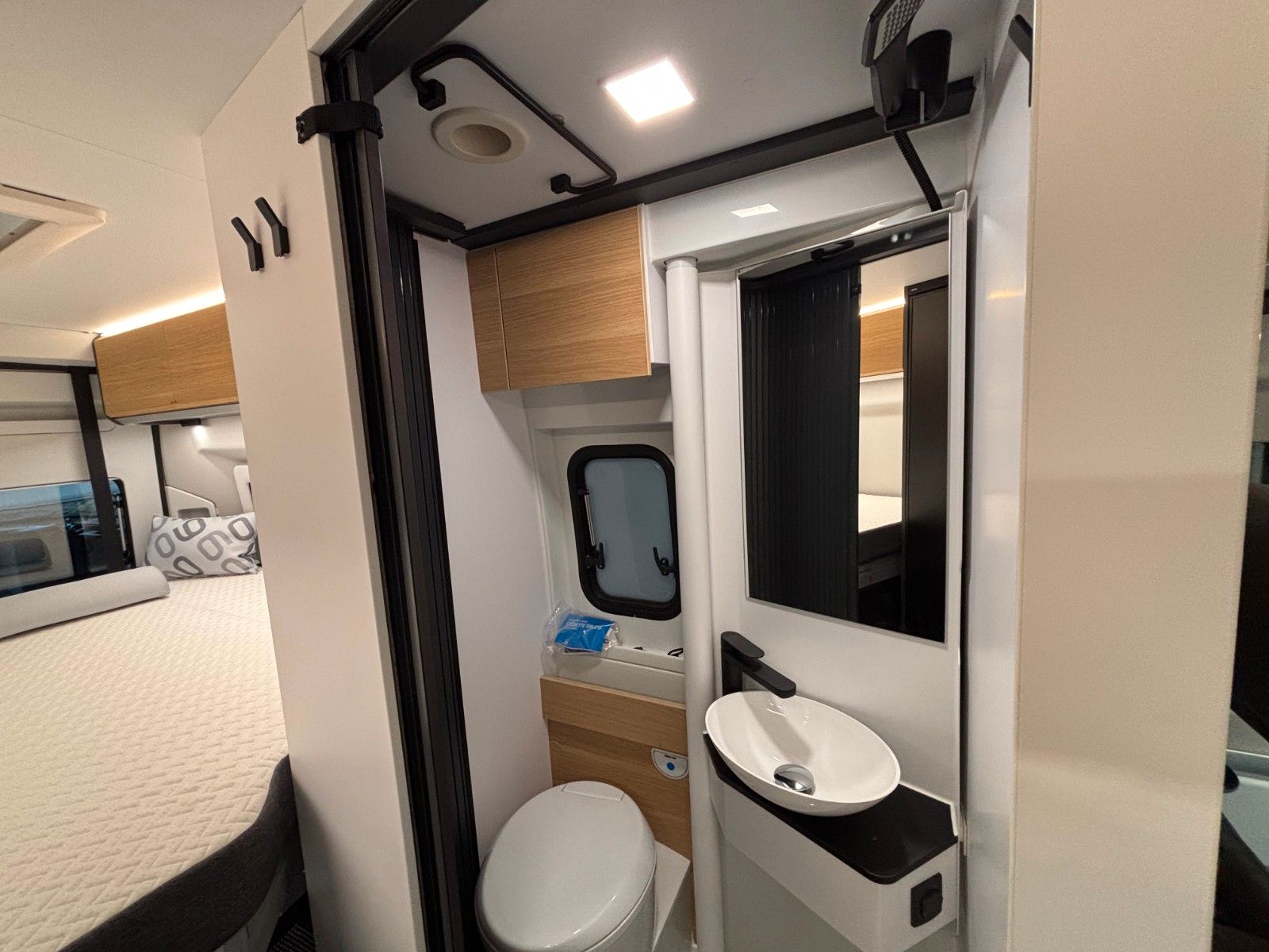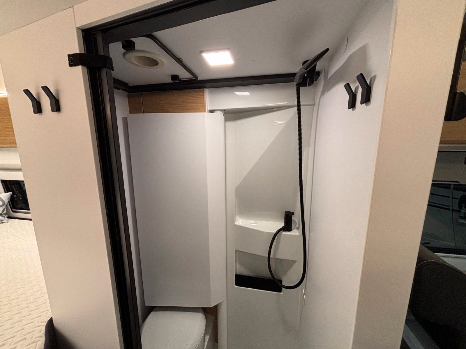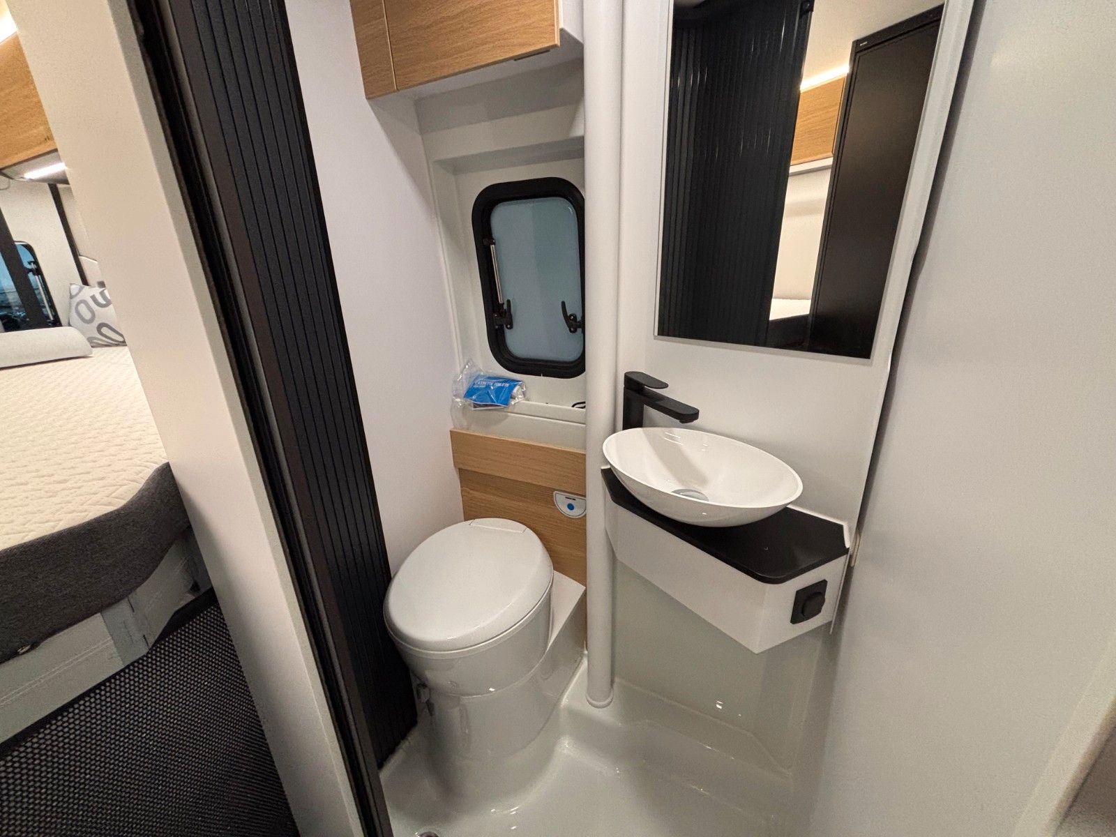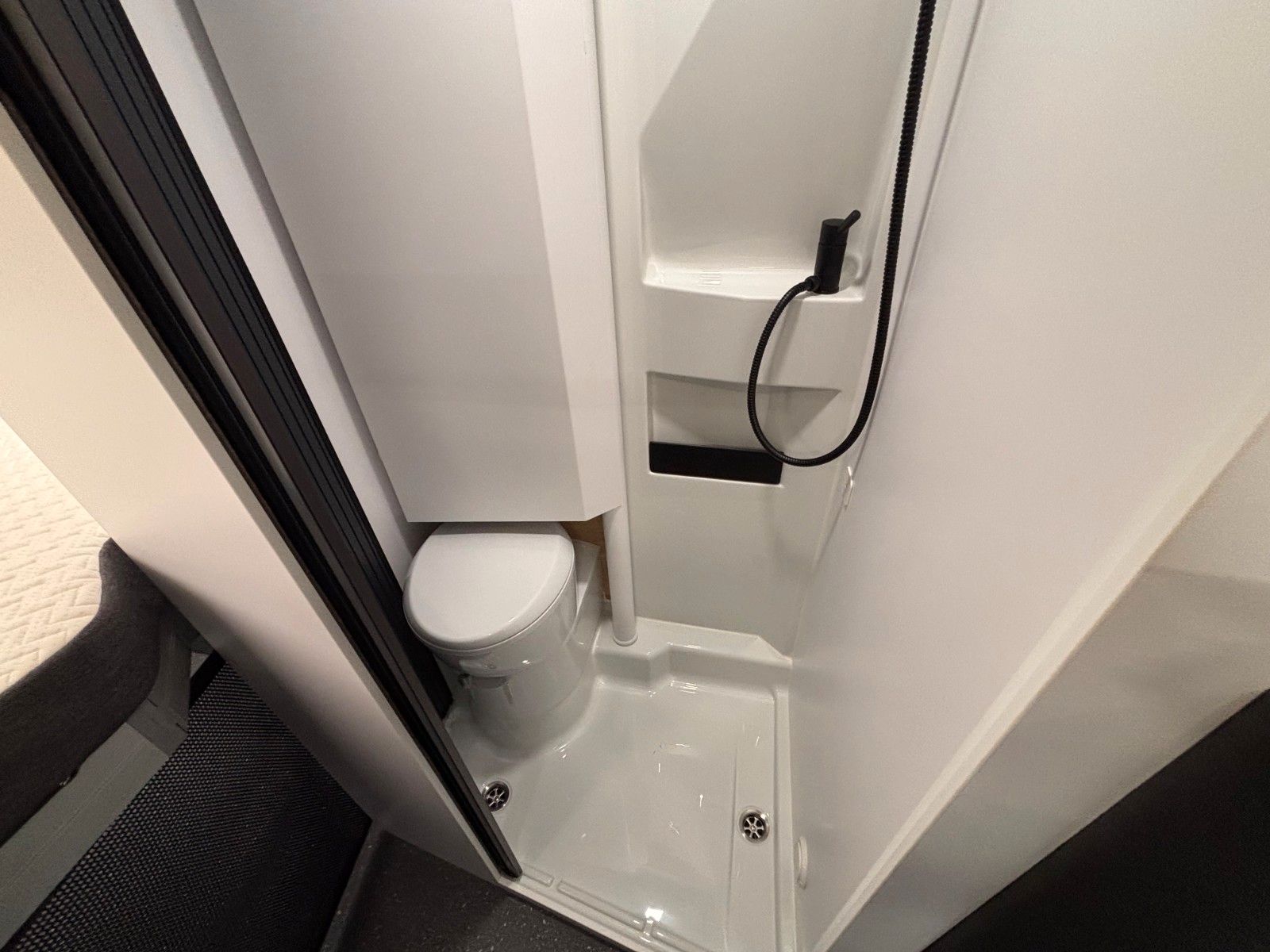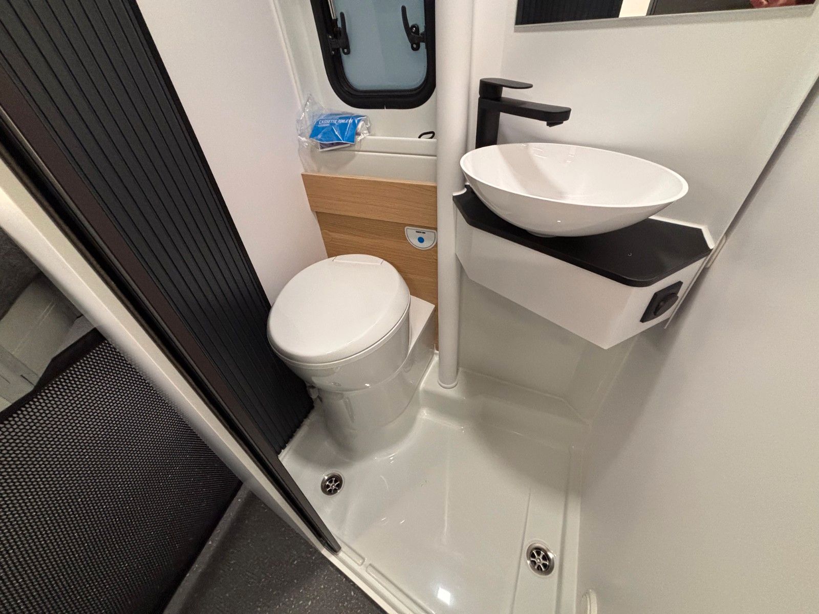 - Dusche, Schwenkbad, Cassetten-Toilette mit elektr. Spülung.