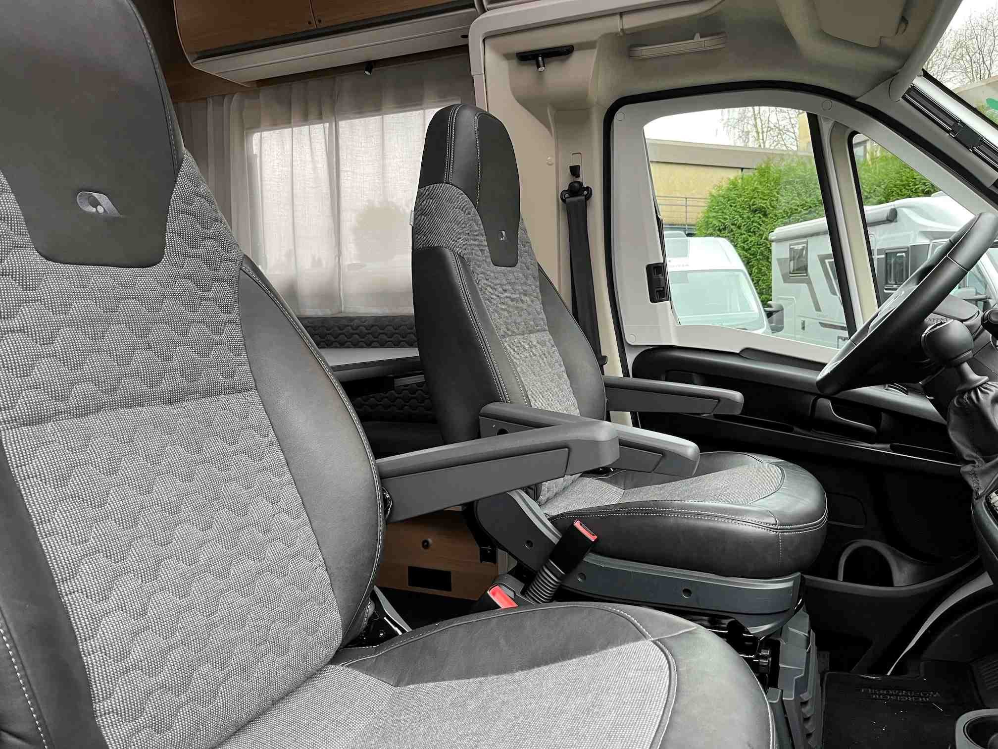 Dank des elektrisch absenkbaren Hubbetts und der Einzelbetten im Heck lässt sich der Raum flexibel nutzen – egal, ob du gemütlich entspannen oder unterwegs arbeitest.